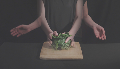 The Artist works meticulously to turn the piece of clay into a perfect form. After squeezing that “perfect” form she worked on for a while, she takes a picture of the work and puts it on a large blue wall were there are already plenty of other photographs.